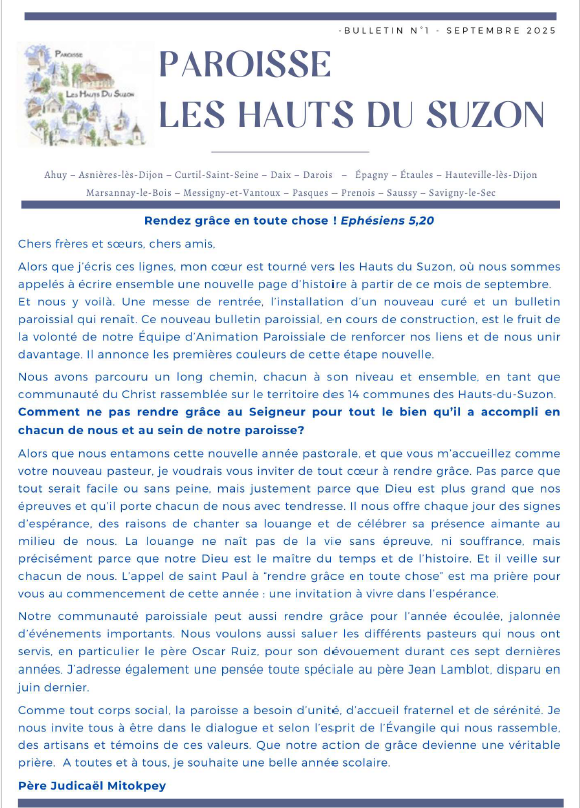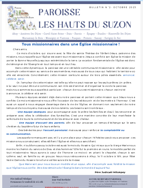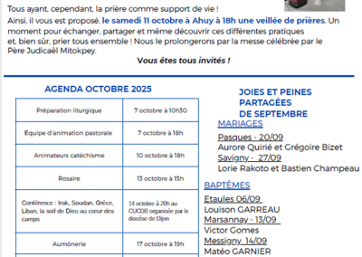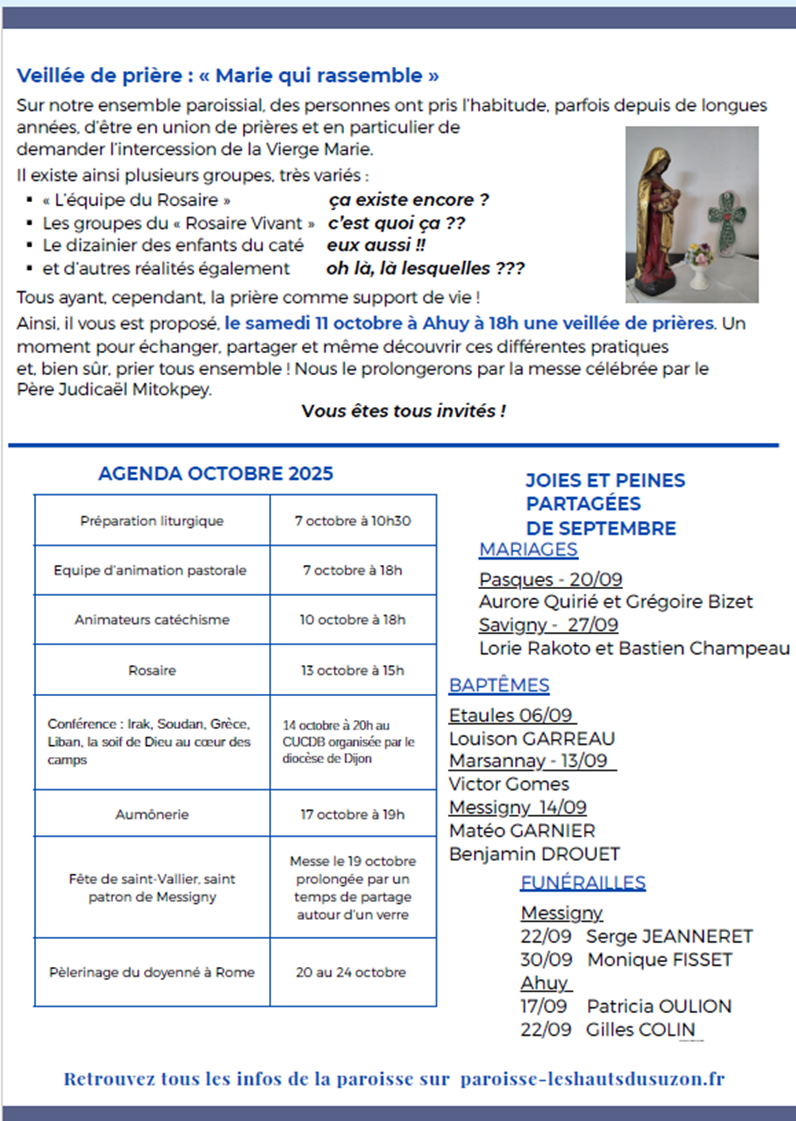 Page 4 : Veillée de prière « Marie qui rassemble » par l’équipe du Rosaire, agenda octobre 2025, joies et peines partagées en septembre.